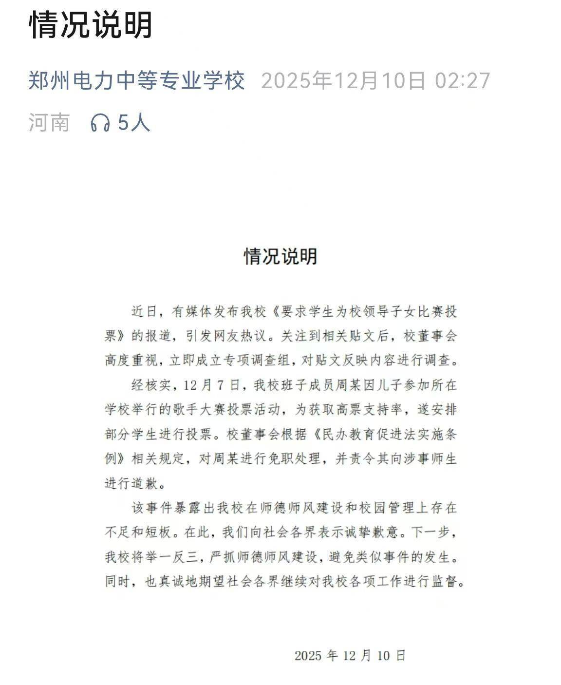 人民网郑州12月10日电 (记者尚明桢)12月10日凌晨,河南郑州电力中等专业学校发布情况说明,就校领导安排学生为其子女比赛投票一事作出回应,涉事校领导已被免职并责令道歉,校方同时向社会诚挚致歉并承诺全面整改。