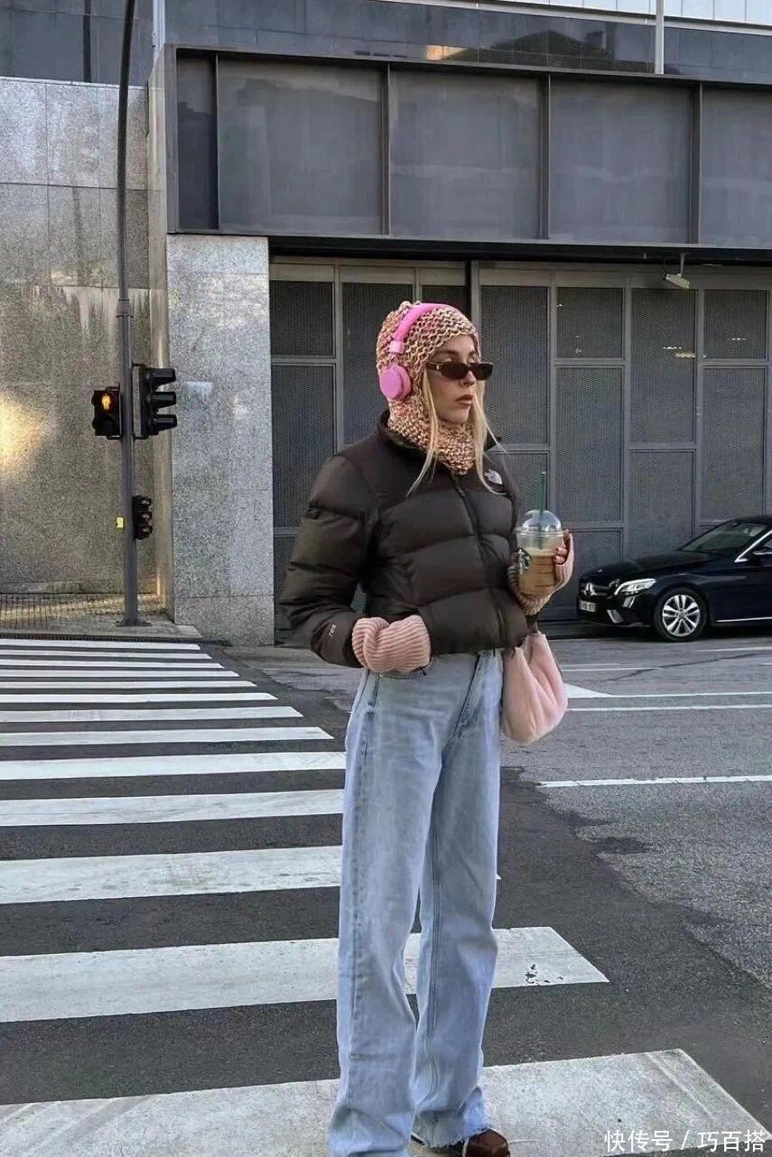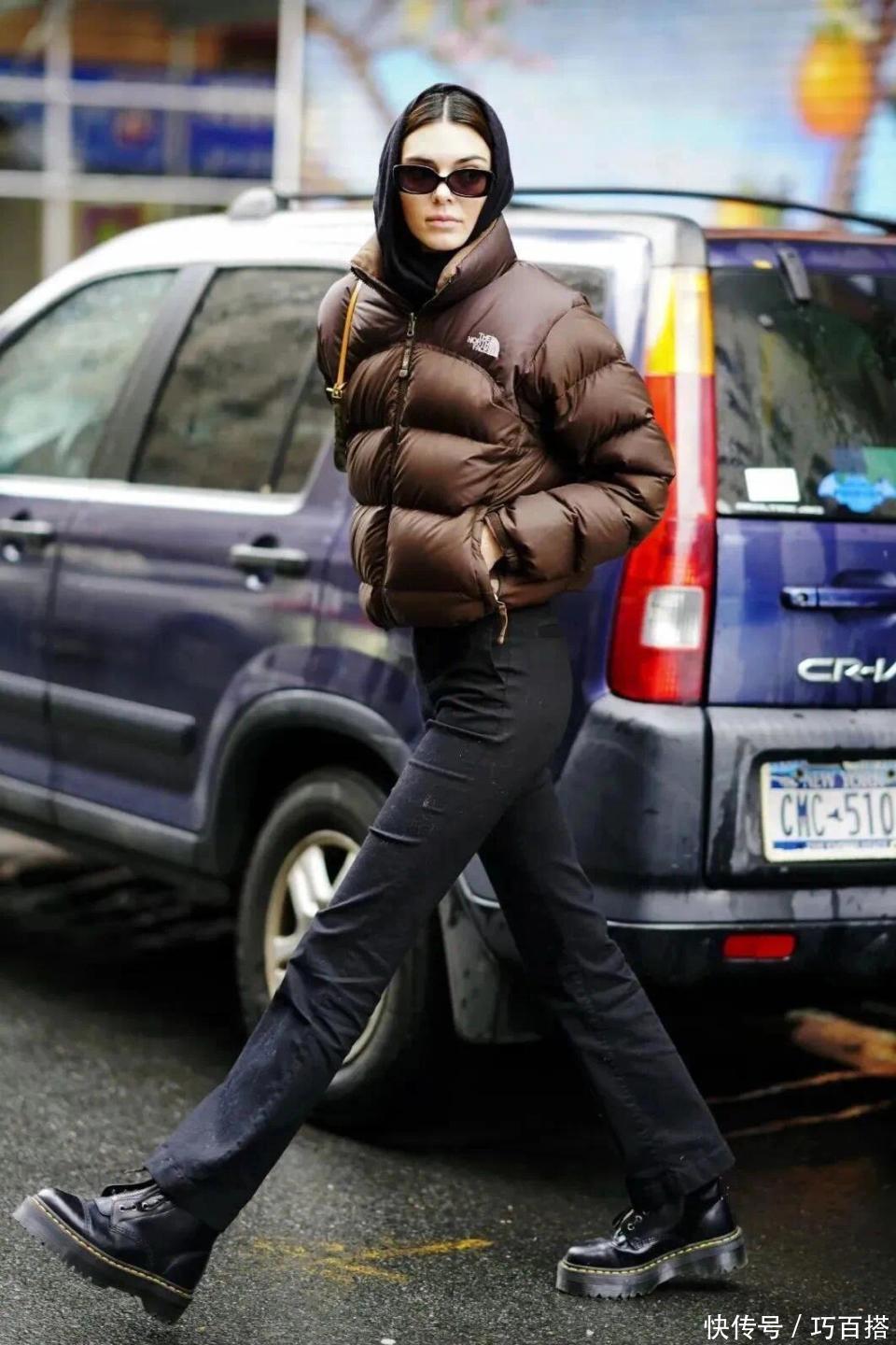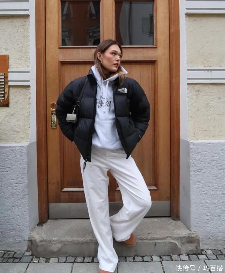 除此之外,大家也可以考虑基础色的组合模式,黑色羽绒服搭配水洗蓝牛仔裤,经典基础,日常外穿出门轻易不会踩雷。