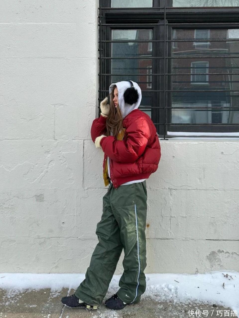 也可以像博主一样选择撞色的搭配模式,红色短款羽绒服搭配墨绿色长裤层次分明,存在感一绝,走在人群中绝对是最亮眼的存在。